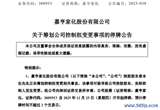 12月24日晚,嘉亨家化(300955)公告,公司于2025年12月24日收到控股鞭策曾本生的奉告,获悉控股鞭策曾本生正在有规画限度权变更洽商事宜,该事项可能导致公司控股鞭策、本体限度东说念主发生变更。