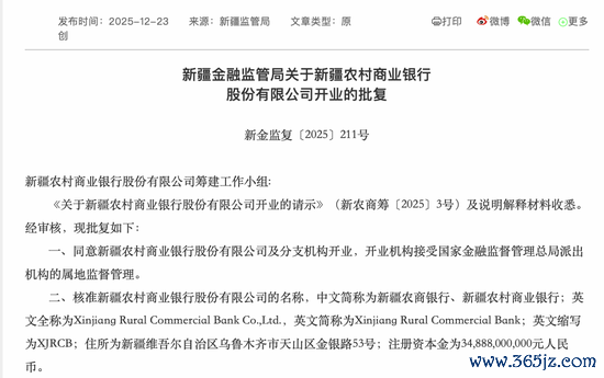 新疆省级农商行改良赢得关节融会。12月23日,新疆金融监管局批复痛快新疆农村生意银行股份有限公司(下称“新疆农商行”)开业,从获批筹建到获准开业仅用时46天。